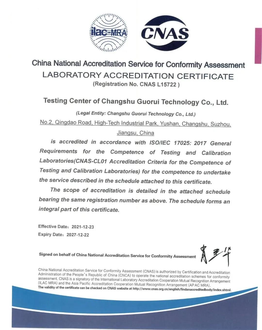 本次獲得CNAS認可資質(zhì)證書,標志著國瑞科技公司檢測中心具備國家及國際認可的硬件條件、檢測技術和管理水平,是對檢測中心專業(yè)技術水平、檢測能力的客觀肯定。同時該中心可依據(jù)國際認可準則開展檢測服務,出具的檢測結果在行業(yè)內(nèi)具有更高的認可度和公信力,為客戶提供更優(yōu)質(zhì)高效的服務,為國瑞科技公司產(chǎn)品的可靠性保駕護航,增強市場競爭能力。
