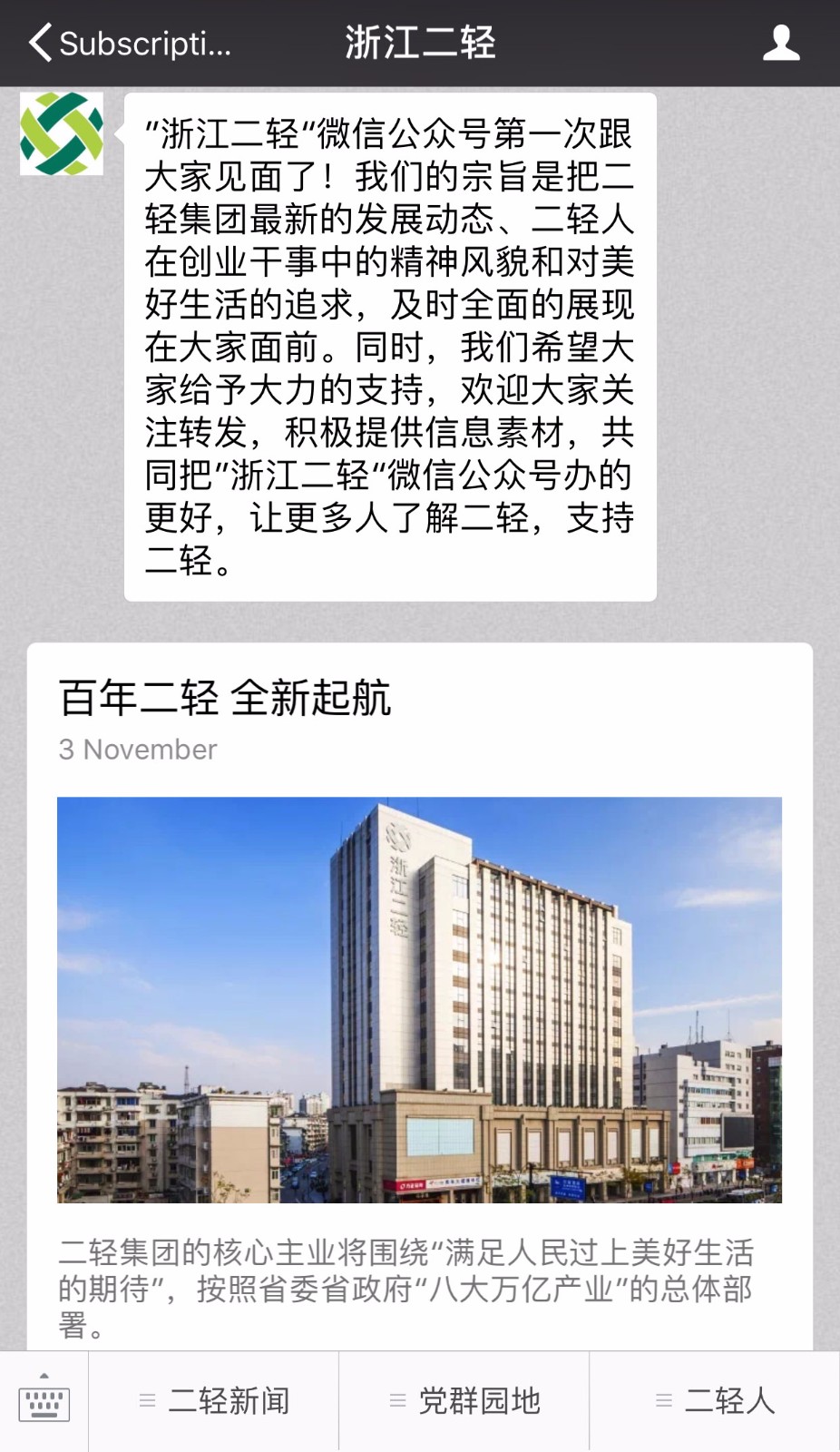 ”浙江二輕“微信公眾號第一次跟大家見面了!我們的宗旨是把二輕集團(tuán)最新的發(fā)展動(dòng)態(tài)、二輕人在創(chuàng)業(yè)干事中的精神風(fēng)貌和對美好生活的追求,及時(shí)全面的展現(xiàn)在大家面前。同時(shí),我們希望大家給予大力的支持,歡迎大家關(guān)注轉(zhuǎn)發(fā),積極提供信息素材,共同把”浙江二輕“微信公眾號辦的更好,讓更多人了解二輕,支持二輕。